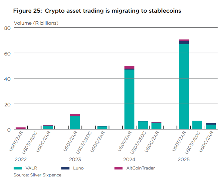 - Since 2022, trading volumes for U.S. dollar–pegged stablecoins have surged from under R4 billion ($234 million) to nearly R80 billion ($4.7 billion) this year.